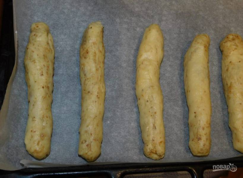 Из теста сформируйте палочки и выложите их на противень, застеленный бумагой для выпечки. Поставьте в духовку, разогретую до 200 градусов, на 15 минут.