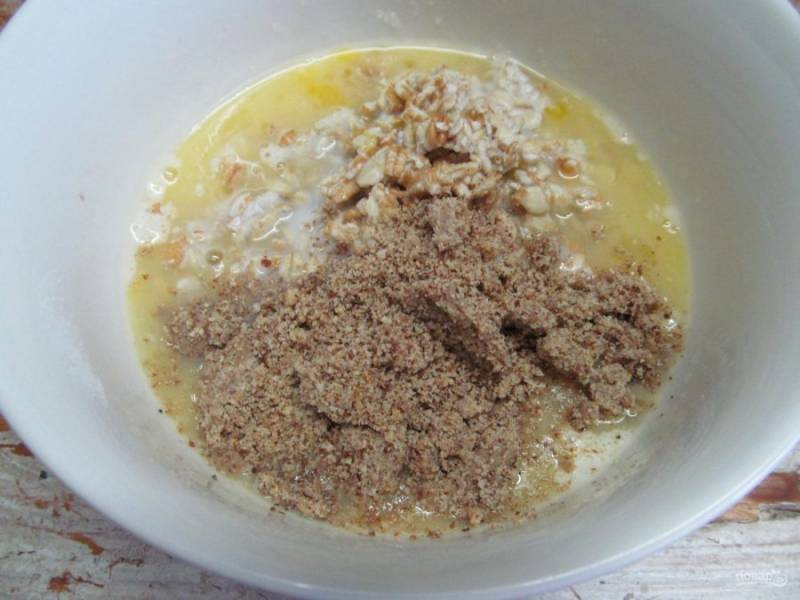 Кефирную смесь смешайте с перебитыми орехами и смесью из молока и хлопьев. Все тщательно перемешайте и дайте настояться 20 минут.