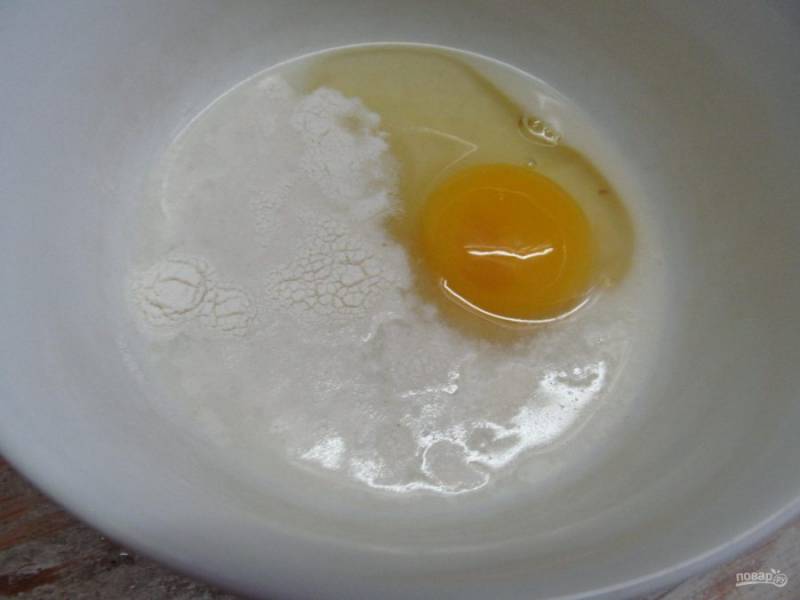 В кефире погасите соду, вбейте яйцо, добавьте ванильный сахар, соль, сахар. Взбейте венчиком.