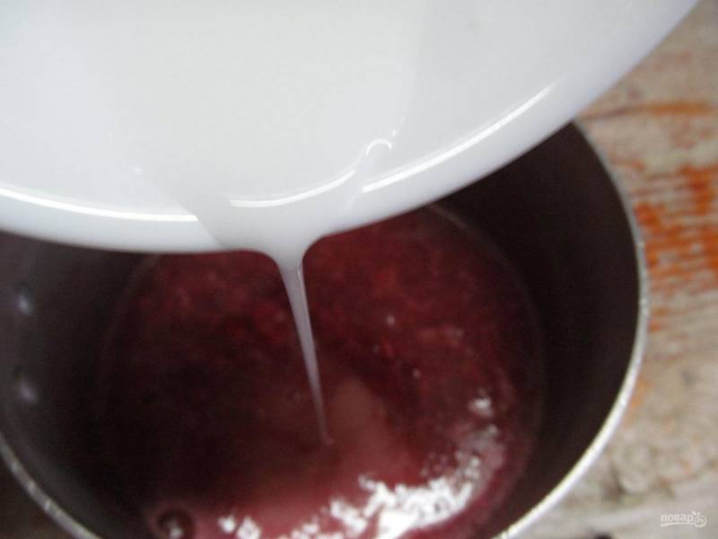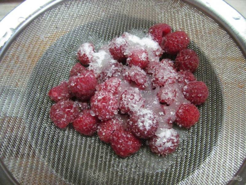 Приготовим малиновый соус. Малину смешайте с сахаром и перетрите через сито.
