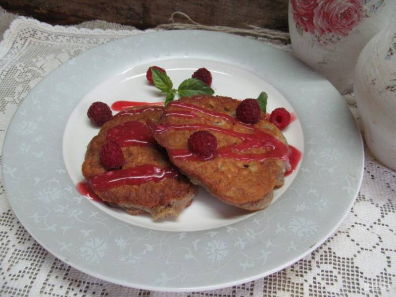 Готовые оладьи полейте малиновым соусом. Приятного аппетита!