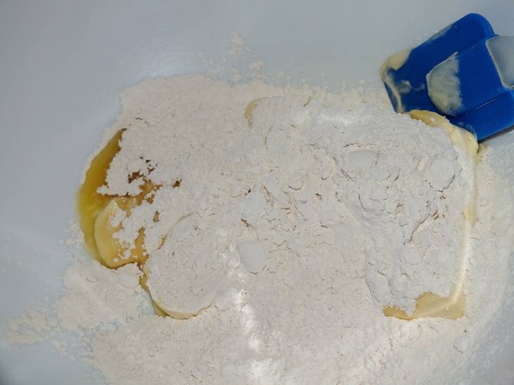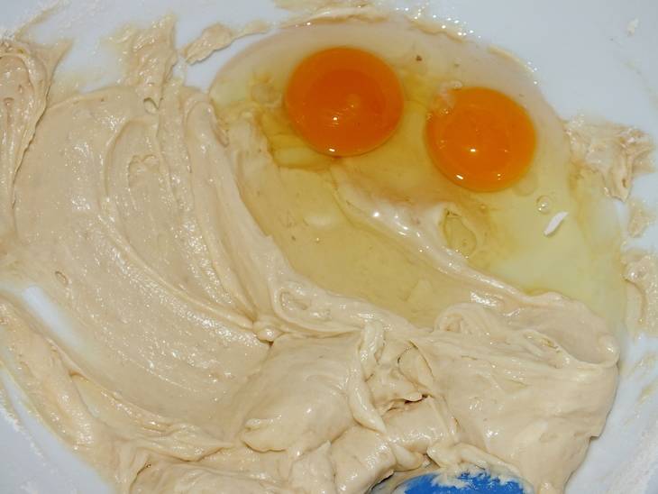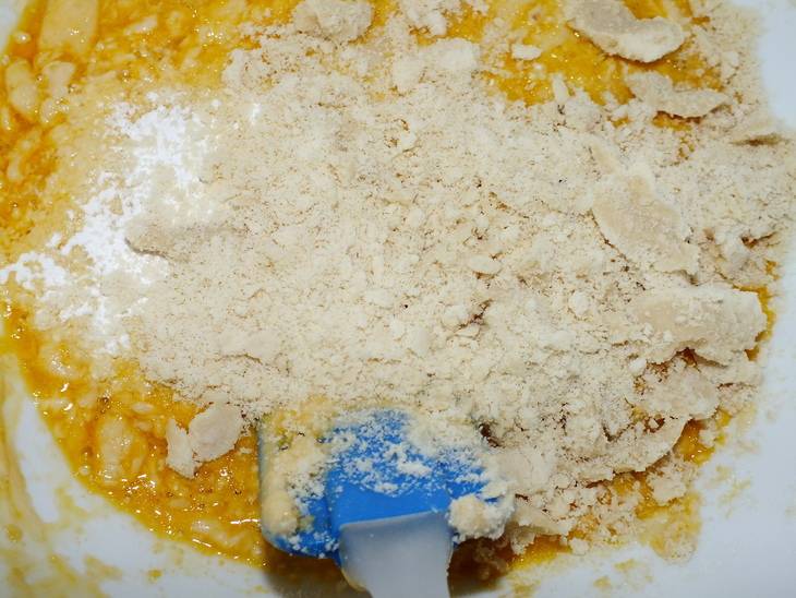 Миндаль очистить от кожицы и измельчить в пудру. Добавить в яично-масляную массу.