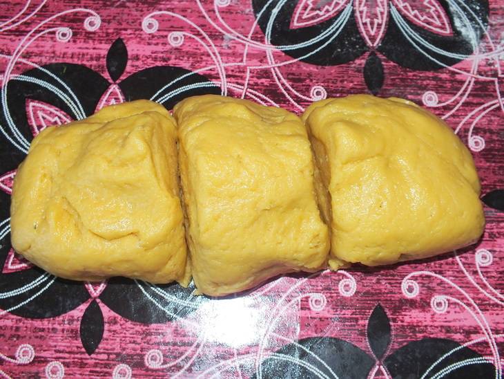 В последнюю очередь ввести разрыхлитель и муку. Замесить мягкое, эластичное тесто. Для удобства тесто поделить на 3 части. Каждую часть раскатать в тонкую и длинную колбаску.