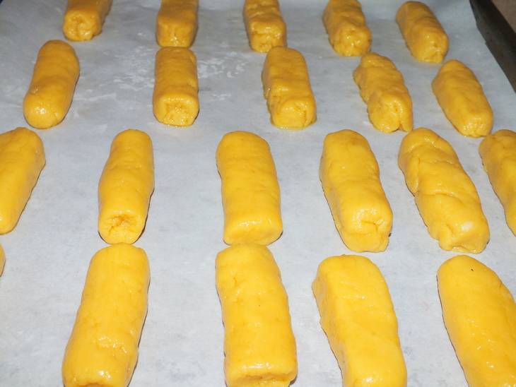 Нарезать брусочки примерно по 7 см. Выложить на застеленный пекарской бумагой противень. Выпекать при t-180* - 10 минут (я выпекала дольше, т. к. за 10 минут у меня печенье не пропеклось). По готовности печенью дать остыть.