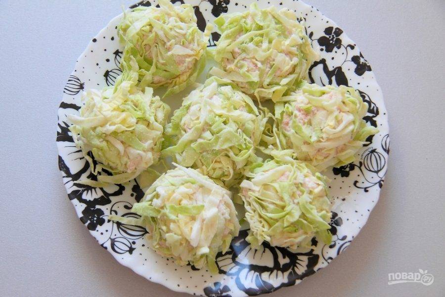 Смочите руки в холодной воде и сформируйте из получившегося фарша фрикадельки, размер выбирайте на свое усмотрение. Обваляйте фрикадельки поочередно в нарезанных капустных листьях.