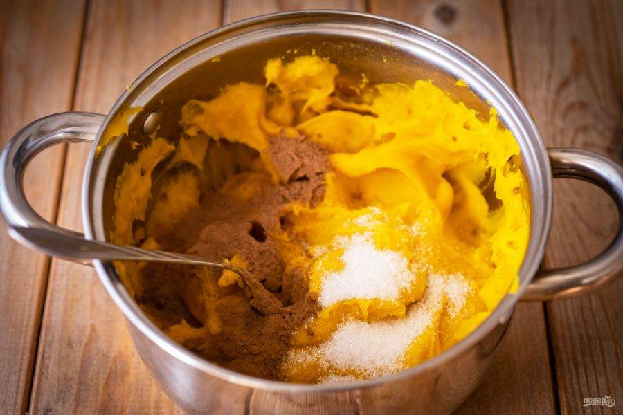 В кастрюлю к пюре добавьте мускатный орех, корицу и 40 грамм сахара. Перемешайте все.