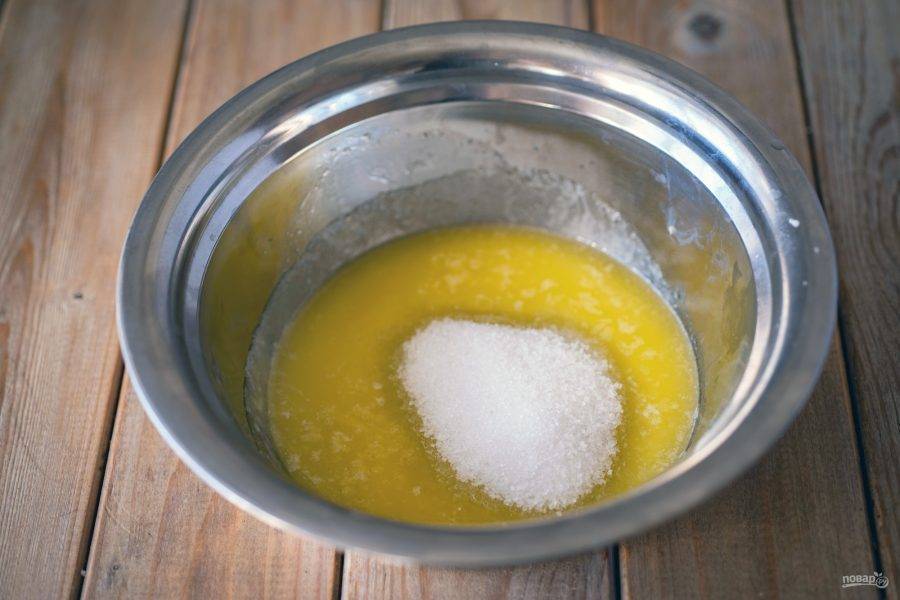 В отдельную миску залейте растопленное на маленьком огне в сотейнике сливочное масло, добавьте сахар. Перемешайте все венчиком.
