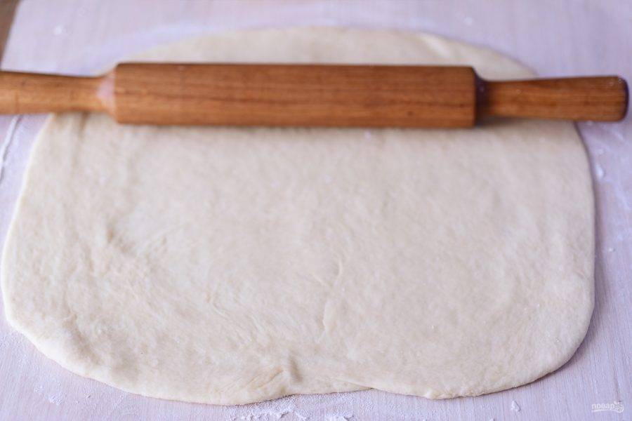 Рабочую поверхность припылите небольшим количеством муки, выложите тесто, раскатайте его в прямоугольный пласт толщиной примерно в 0.7-1 см. Для удобства в работе я всю массу теста поделила на две части.