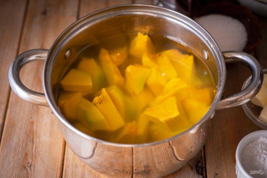 За это время приготовьте тыквенное пюре. Кусочки тыквы почистите от кожуры и семян, нарежьте произвольными кусочками, отварите в кастрюле с водой до мягкости.