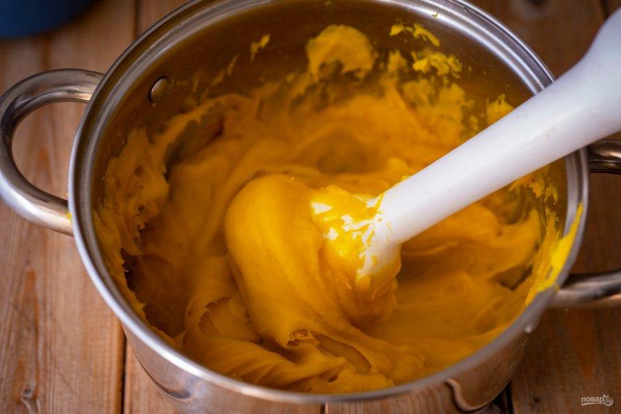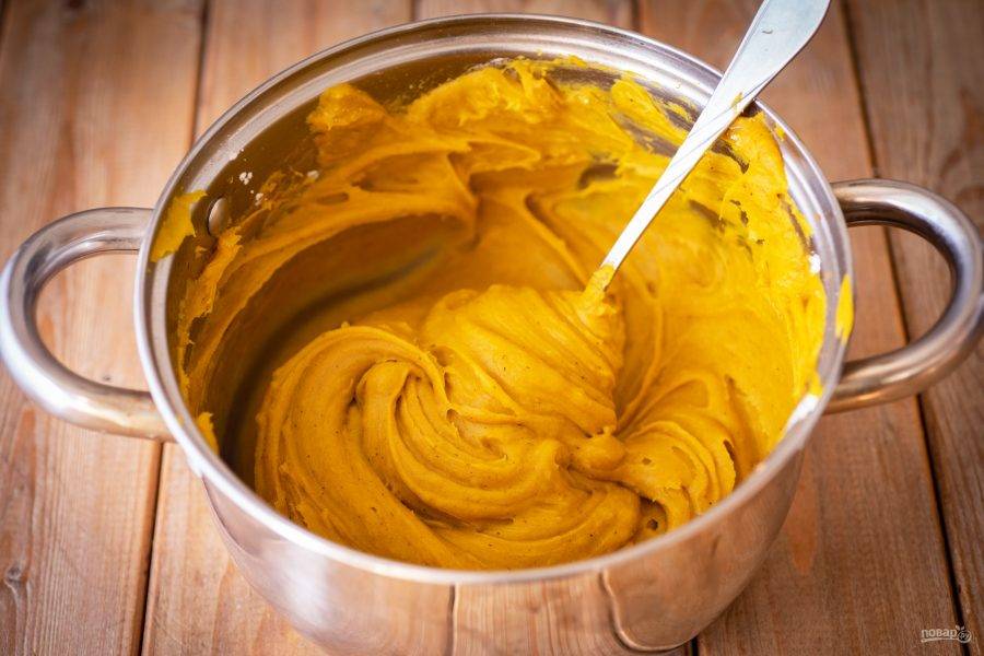 Затем с отваренной тыквы слейте воду и пробейте погружным блендером до получения однородного тыквенного пюре. Нам потребуется 800 грамм пюре.