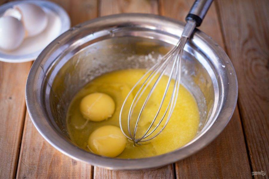 Вбейте яйца. Перемешайте все венчиком до получения однородной смеси.