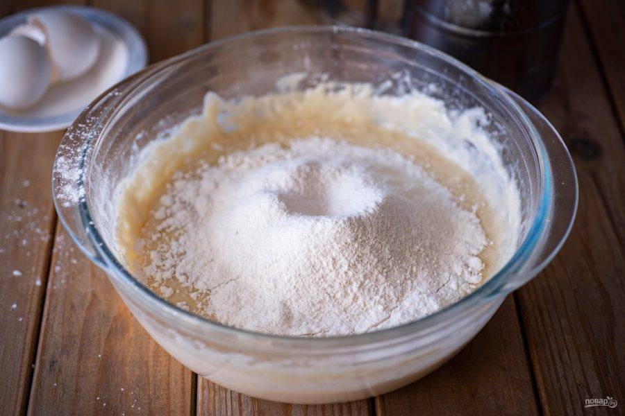 Теперь начинайте просеивать муку частями и одновременно вмешивать ее сначала ложкой, затем вымешивайте тесто руками. У вас должно в итоге получиться мягкое, не прилипающее к рукам тесто, поэтому чуть больше или чуть меньше муки может понадобиться. Вымешивайте тесто руками 5-7 минут.