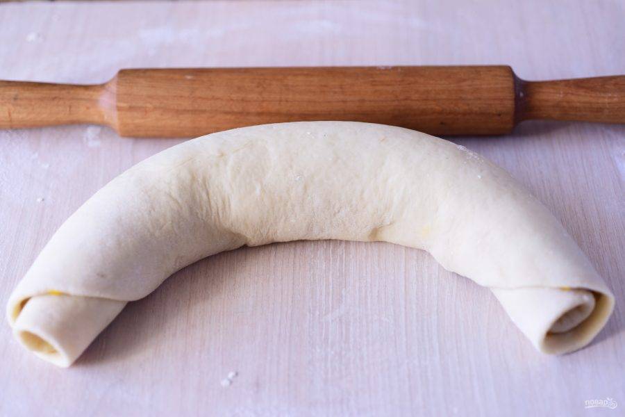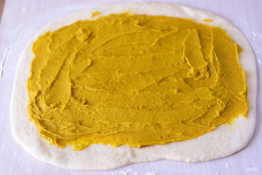 Затем скатайте из теста с тыквенной начинкой рулетик.