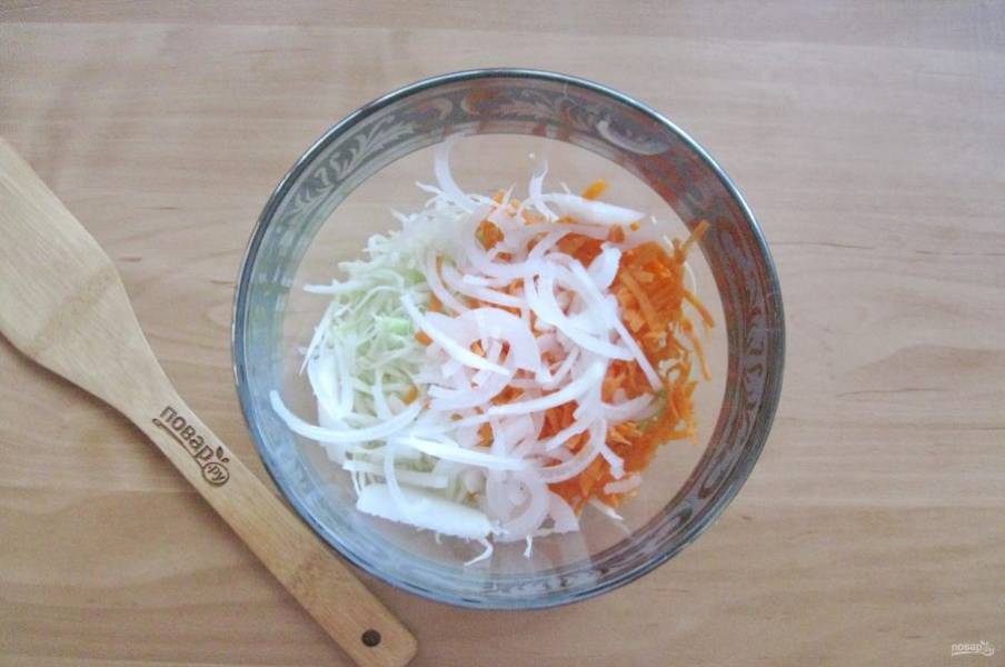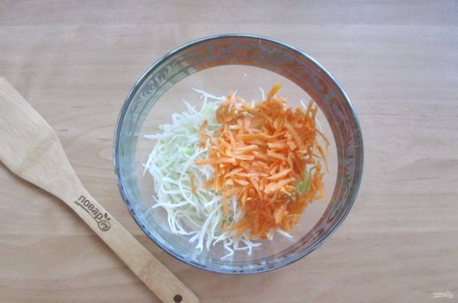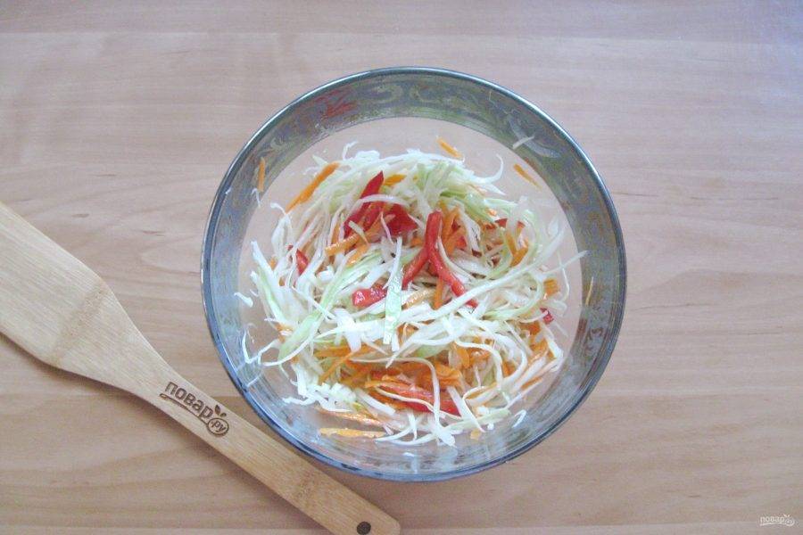 Капусту нарежьте соломкой. Немного посолите и помните руками, чтобы она стала мягче и выложите в салатник.
