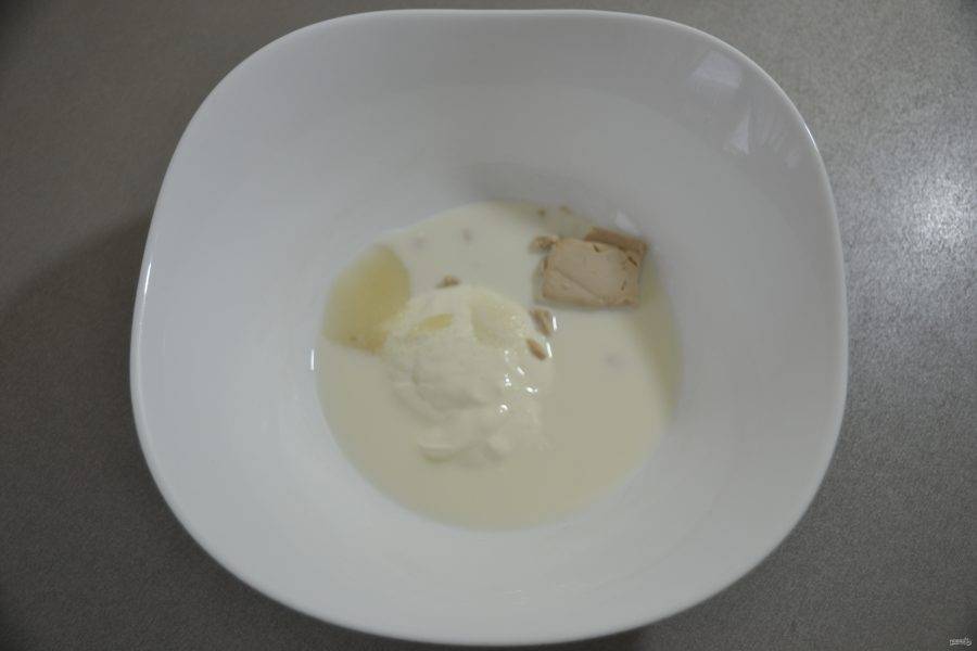 В миску для замешивания теста добавьте сметану, соль, сахар, дрожжи.
