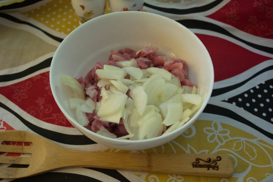 К мясу добавьте нарезанный полукольцами лук.