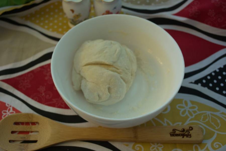 Тесто соберите в шар, переложите в миску. Затяните пленкой, дайте подняться.