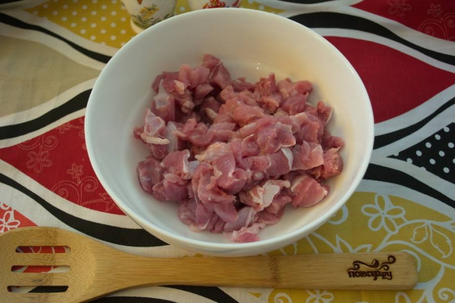 Мясо индейки нарежьте кусочками. У меня мясо с ножки птицы.