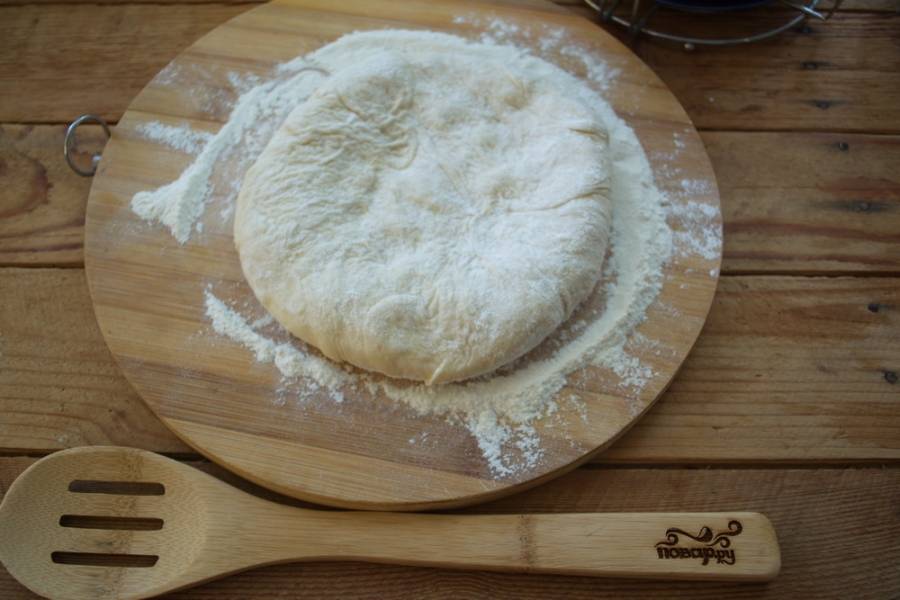 Разделите тесто на 3 части. Доску присыпьте мукой. 1/3 часть теста выложите на доску, разомните руками от центра к краю.
