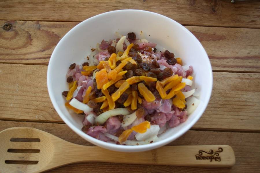 Добавьте специи. Нарежьте промытую курагу. Добавьте промытый изюм. Перемешайте.