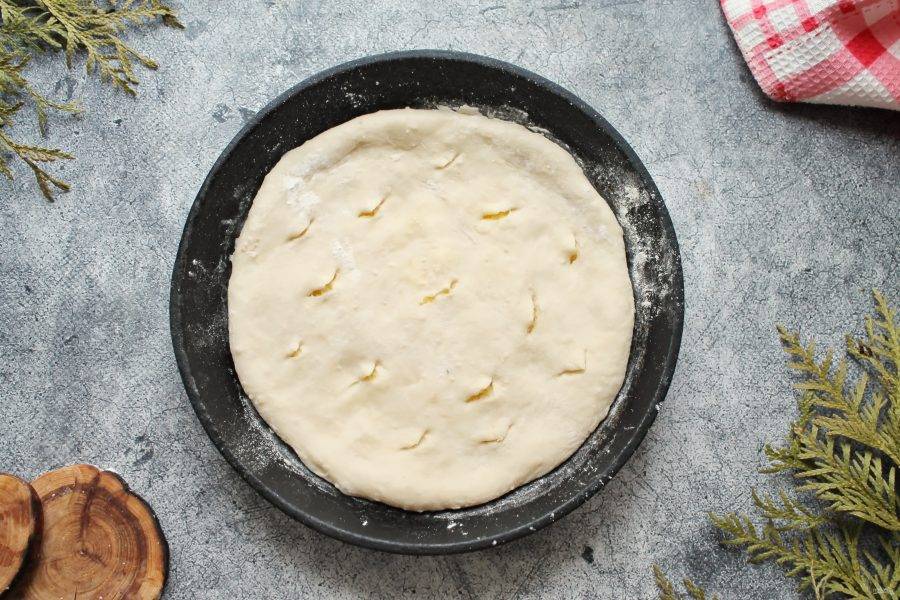 Соедините тесто поверх начинки и защипните. Переверните швом вниз и осторожно руками немного прижмите. Сковороду посыпьте мукой, переложите пирог и потихоньку разминайте пирог в лепешку до краев сковороды. Сделайте небольшие дырочки, не проколов до дна или одну в середине.