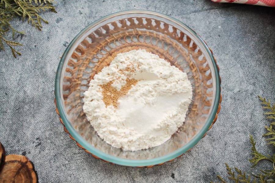 В глубокую миску просейте муку, добавьте соль, сахар и сухие дрожжи. Все хорошо перемешайте.