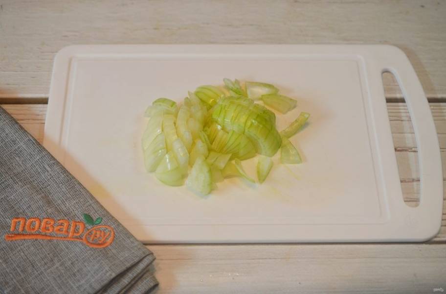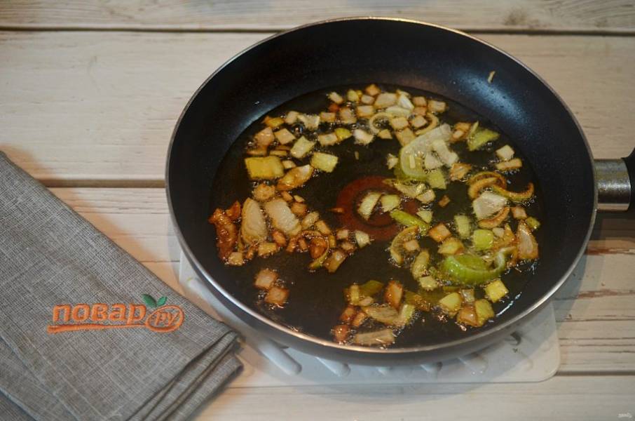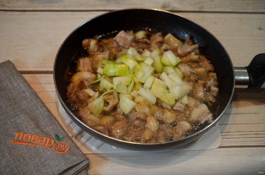 6. Половину нарезанного лука очень хорошо обжарьте. Затем лук удалите из сковороды, он нам больше не понадобится.
