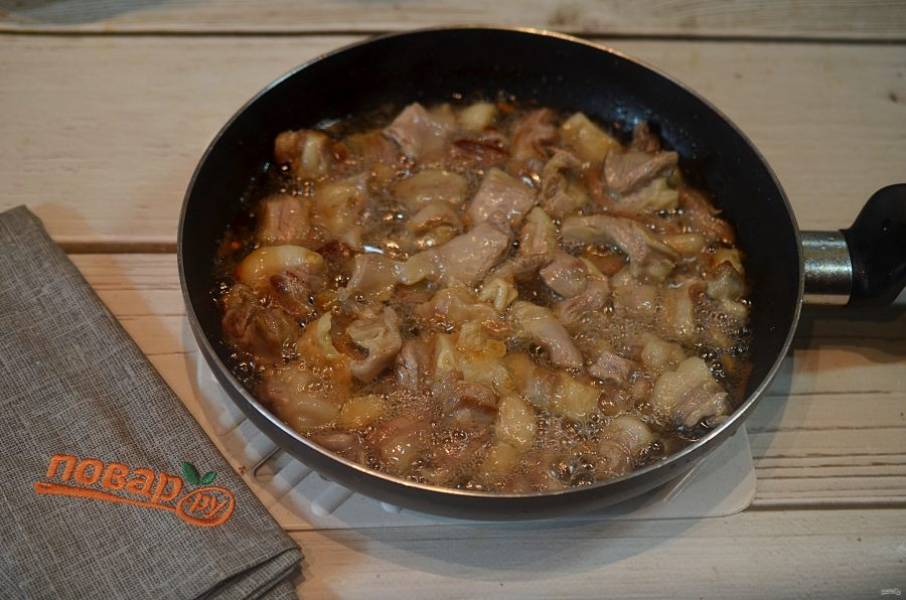 7. Добавьте в эту же сковороду мясо и хорошо обжарьте.