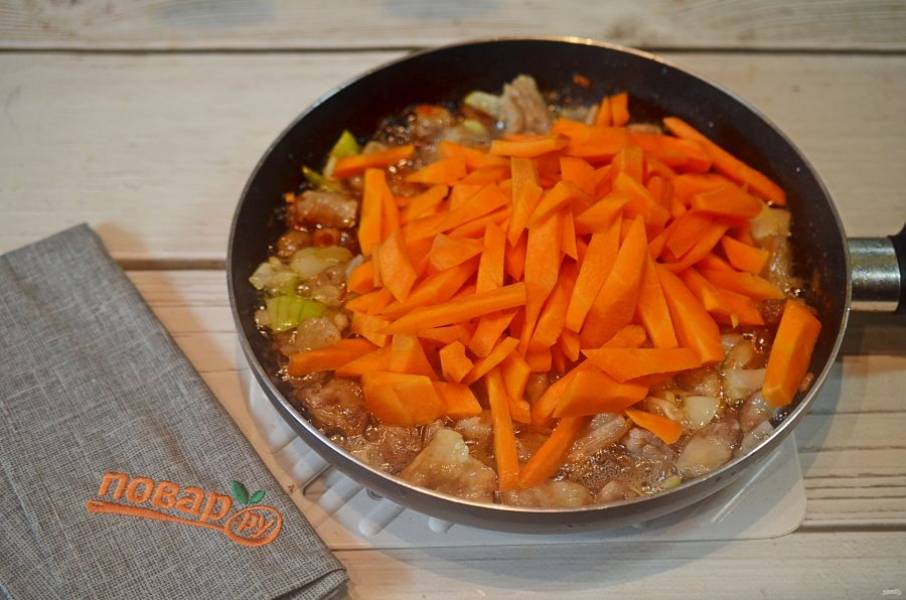 9. Добавьте морковь и зиру. Хорошо все обжарьте до мягкости моркови.