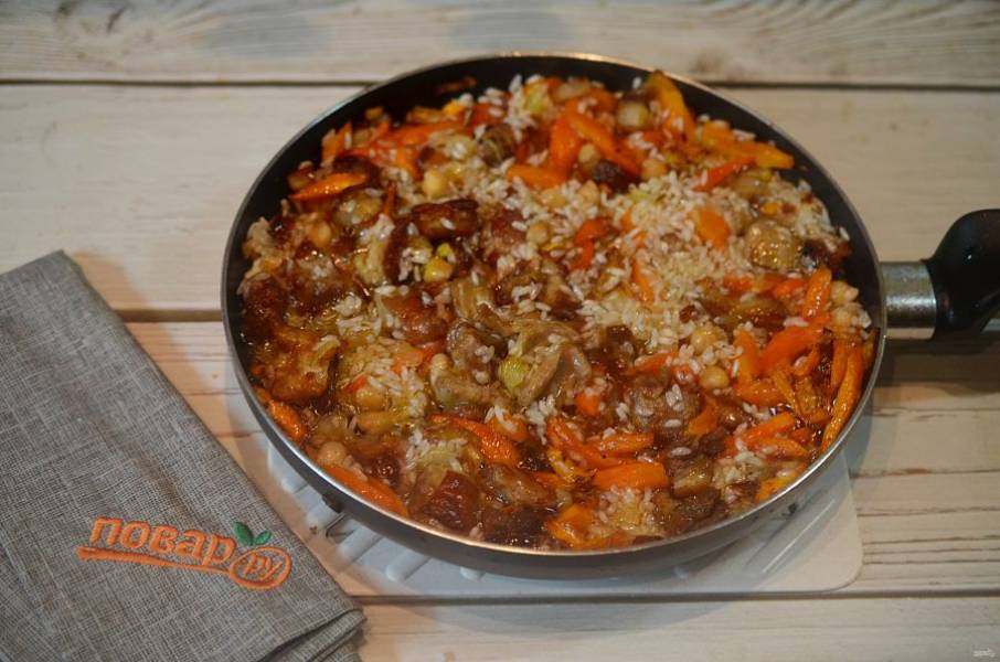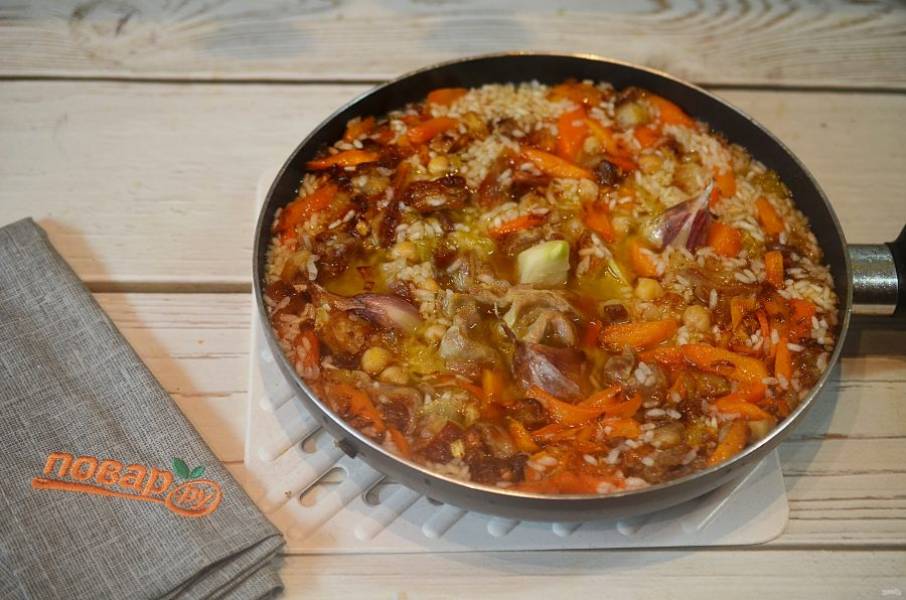 14. Залейте водой, чтобы она была на 1,5 см. выше риса. Доведите до кипения, затем уменьшите огонь, накройте крышкой и готовьте до готовности.
