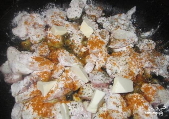 На раскаленную сковороду выложите все мясо осьминога, обжаривайте с растительным маслом на среднем огне 2 минуты. Добавьте соль, специи, давленый чеснок и сливочное масло. Перемешайте.