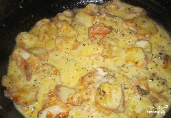 Добавьте воду и сливки, тушите под закрытой крышкой на медленном огне 5 минут. Готово!