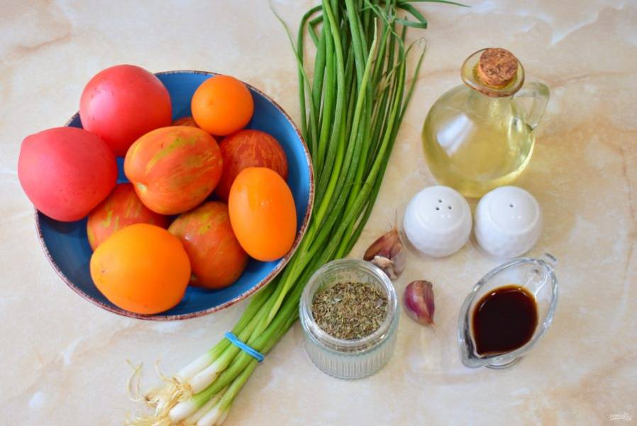 Для приготовления салата подготовьте необходимые ингредиенты. Помидоры можно взять любых имеющихся цветов.