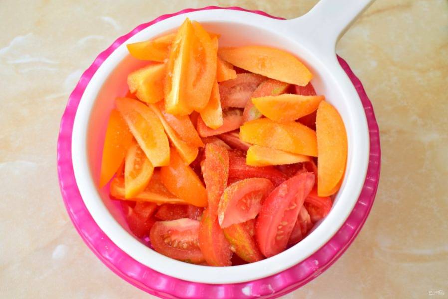 Помидоры промойте и нарежьте крупными ломтиками. Выложите их в дуршлаг и посыпьте солью. Оставьте постоять. Соль вытянет из помидоров лишнюю влагу, которая сразу будет стекать. Благодаря этому готовый салат не будет водянистым.