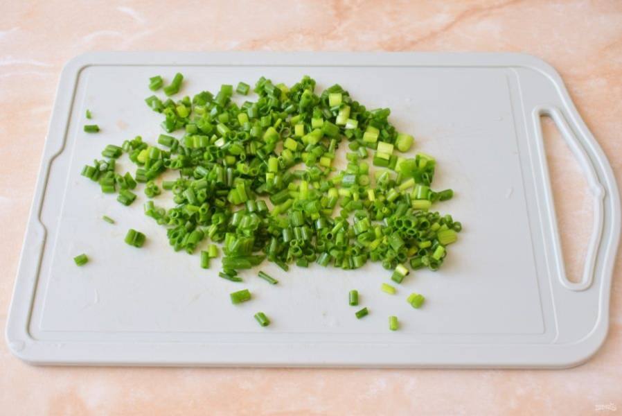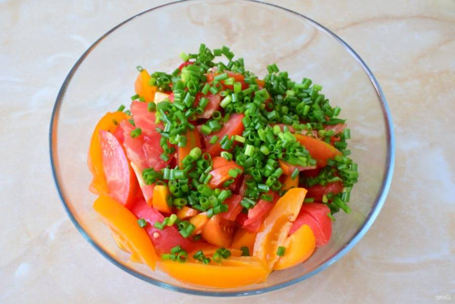 В салатник выложите помидоры и добавьте нарезанный зеленый лук.