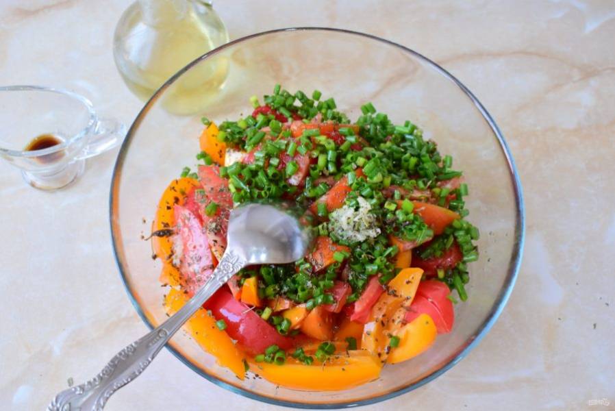 Затем полейте оливковым маслом и бальзамическим уксусом. Добавьте ароматные сушеные травы. Это может быть орегано или базилик. По вкусу подсыпьте соль и молотый перец. Все ингредиенты перемешайте.