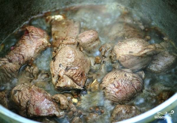 Когда аромат специй наполнит всю кухню (а на это уйдет минуты три), кладем в ароматизированное масло кусочки баранины. Жарим, помешивая, около 15 минут - до образования румяной корочки.