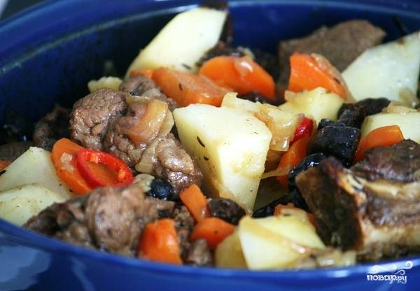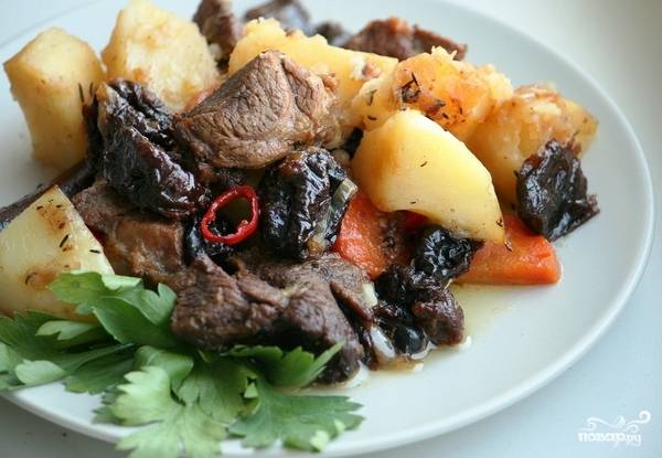 Видео рецепт "Острая баранина с овощами и черносливом"