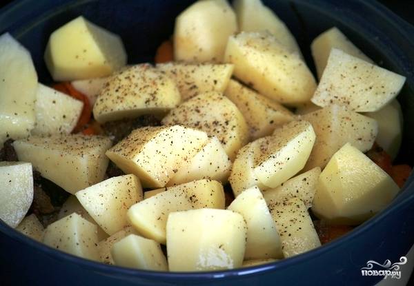 По истечению 40 минут запекания мяса, достаем форму для запекания из духовки, кладем в нее картофель, соль и перец. Аккуратненько перемешиваем.