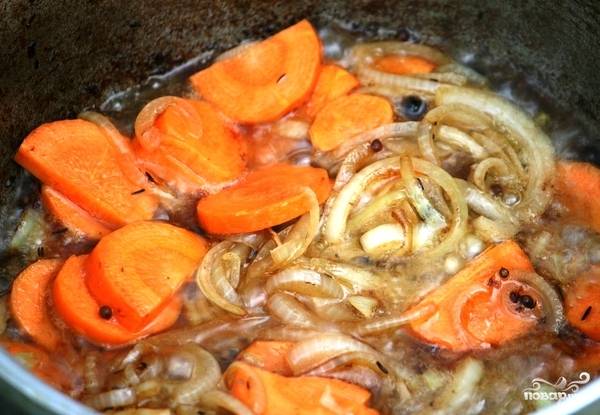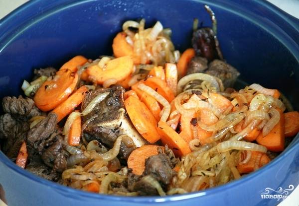 Румяное мясо шумовкой достаем из казана и перекладываем в форму, в которой потом будем запекать блюдо - оптимально, если форма будет керамической. Затем в освободившийся казан бросаем лук, обжариваем пару минут, после чего добавляем к луку морковь и жарим еще 3-4 минуты.