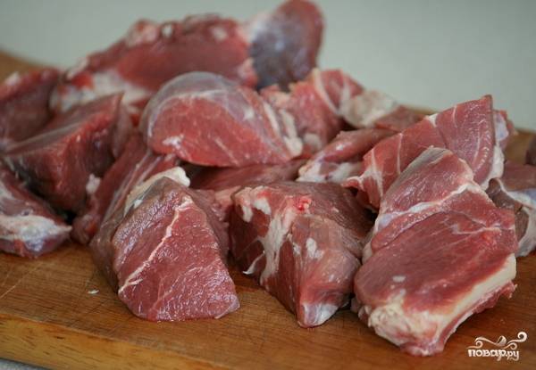 Сырую свежую баранину нарезаем довольно крупными кубиками - примерно 5 на 5 см.