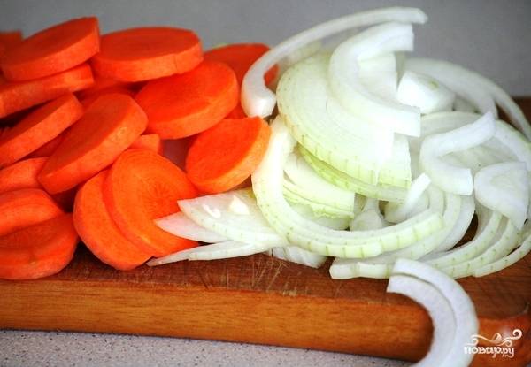 Тем временем лук нарезаем тонкими полукольцами, морковь - тонкими кольцами.