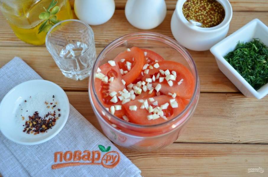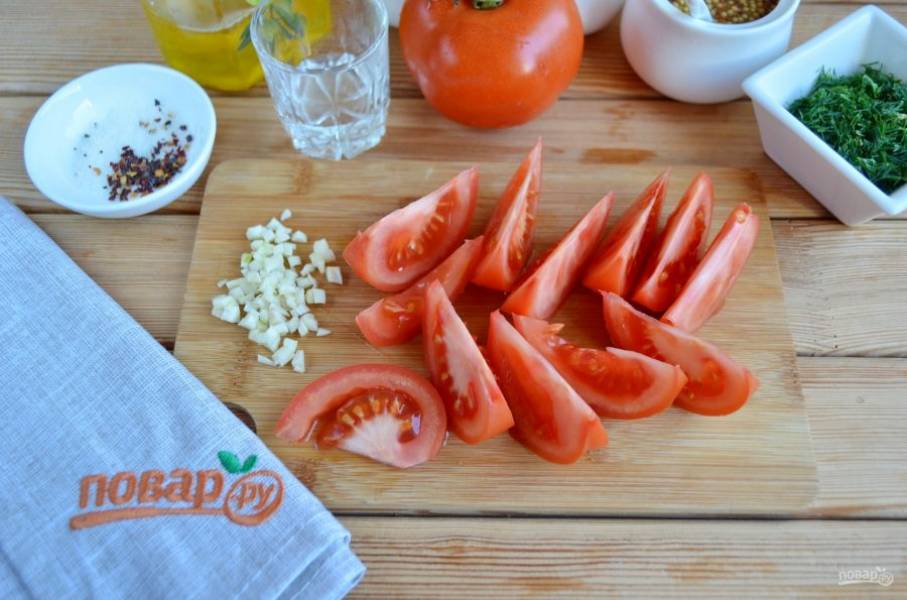 Порубите максимально мелко чеснок, помидоры порежьте дольками.