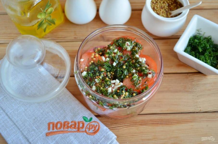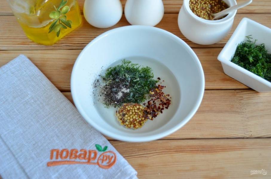 Приготовьте маринад: смешайте масло, уксус, горчицу, соль, сахар, два вида перца и зелень.
