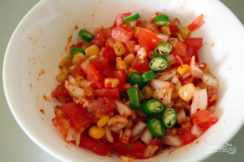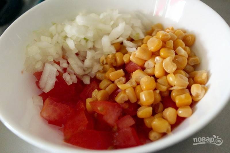 1. В глубокую мисочку отправьте измельченные кубиками лук и помидор, кукурузу.