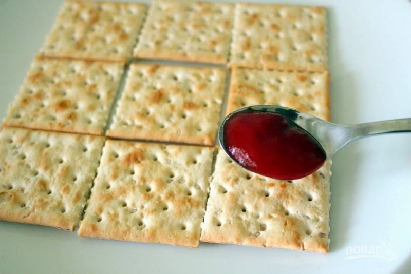 3. Разложите на рабочем столе крекеры. Добавьте чуть томатного (острого или нет по вкусу) соуса.