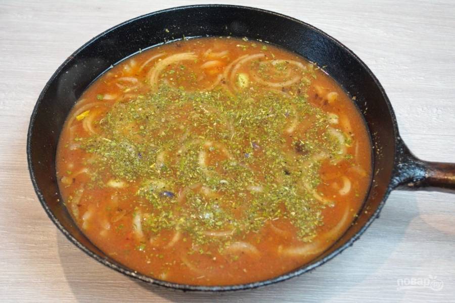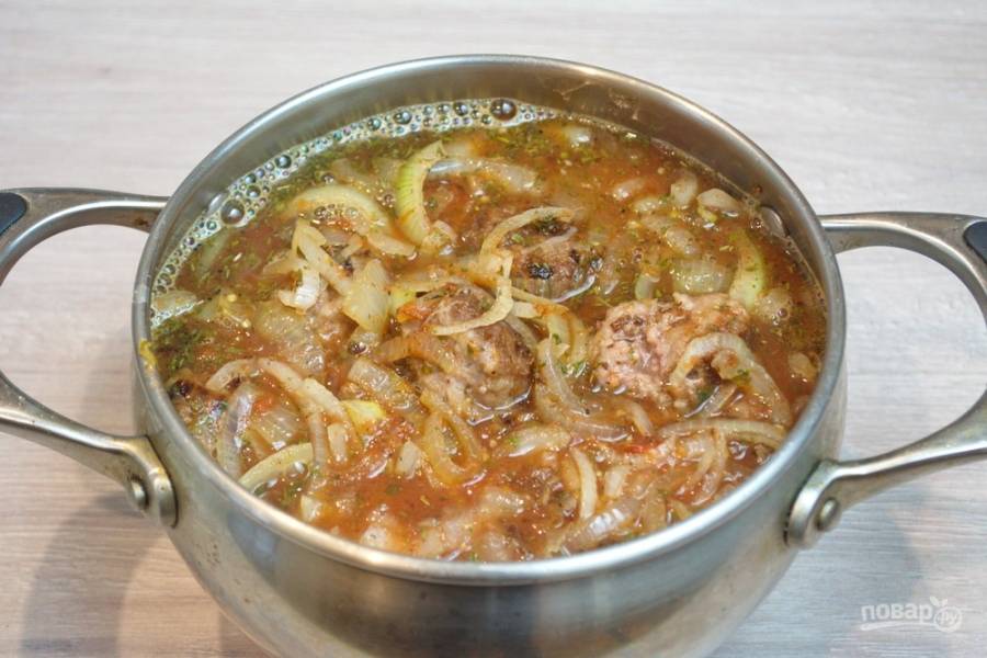 На растительном масле обжарьте лук. Когда он станет мягким и едва румяным, добавьте томатный сок и томатную пасту. Размешайте и дайте закипеть. Добавьте специи, соль, сахар. Можно добавить воды, но столько, чтобы уровень жидкости полностью покрыл наши фрикадельки.