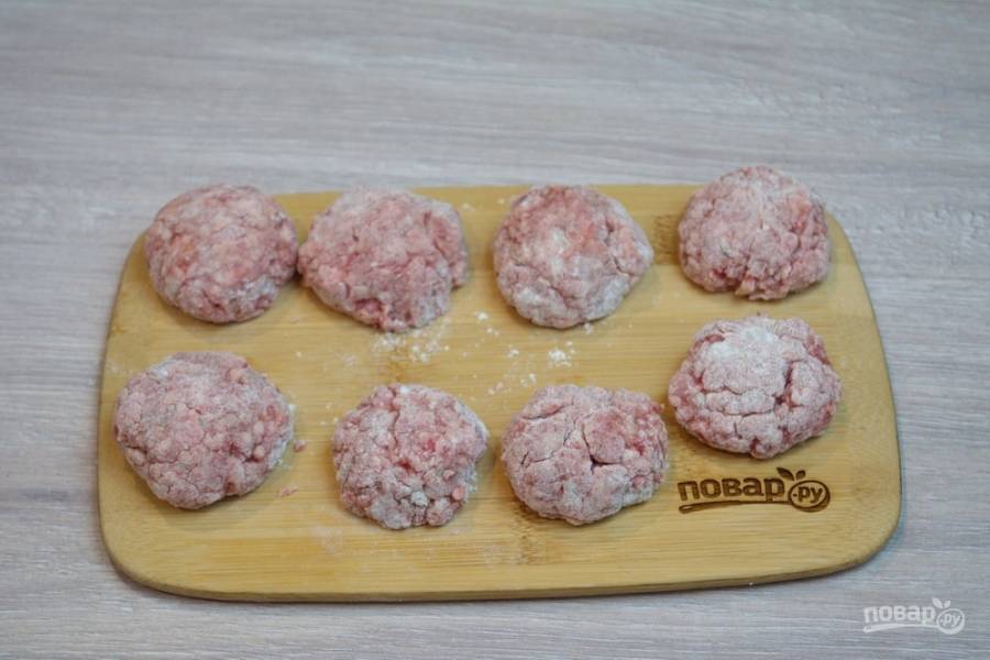 Фарш вымешайте. Можно добавить немного воды (до 1 стакана). Из полученного фарша сформируйте мясные шарики-фрикадельки. Обваляйте их в муке.