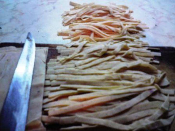 Затем посыпьте ленты мукой и нарежьте на тонкие полоски 0,5 см. Дайте лапше немного подсохнуть.
