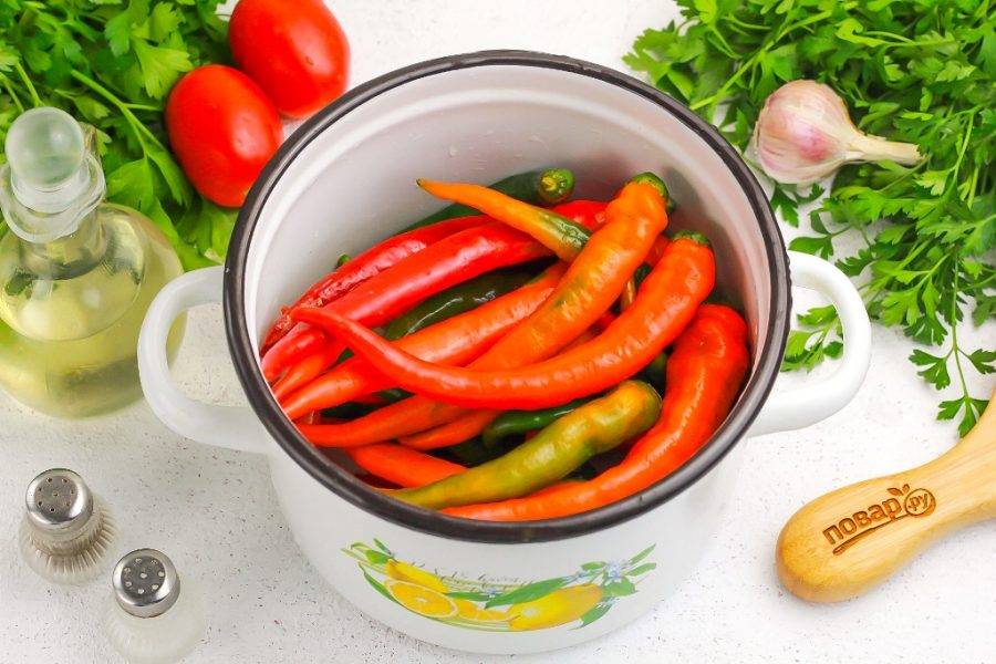 Работайте в перчатках! Выложите стручки перца в кастрюлю или казан, удаляя потемневшие или подпорченные.